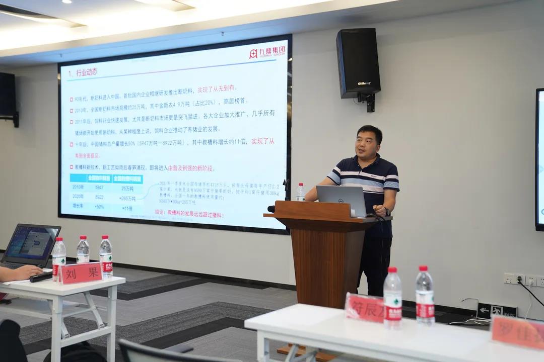 集團(tuán)產(chǎn)品中心總經(jīng)理羅佳捷講解了規(guī)模豬場(chǎng)飼料產(chǎn)品相關(guān)內(nèi)容