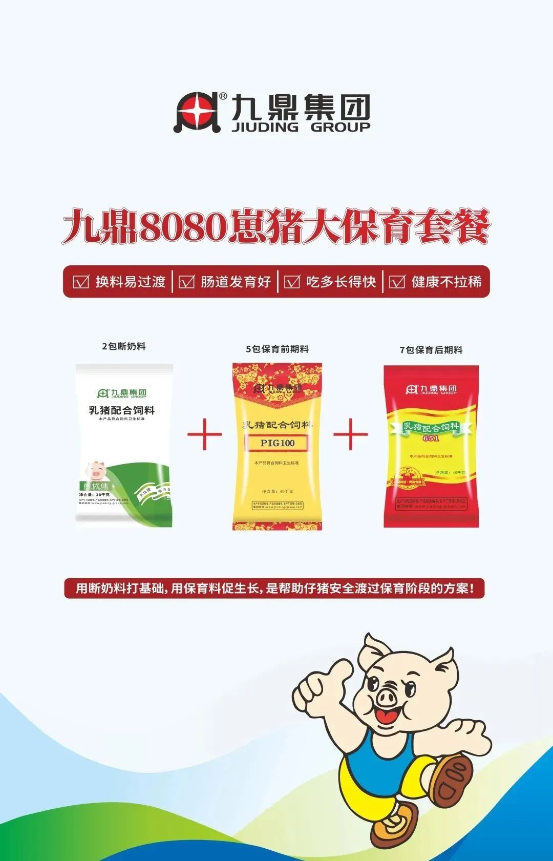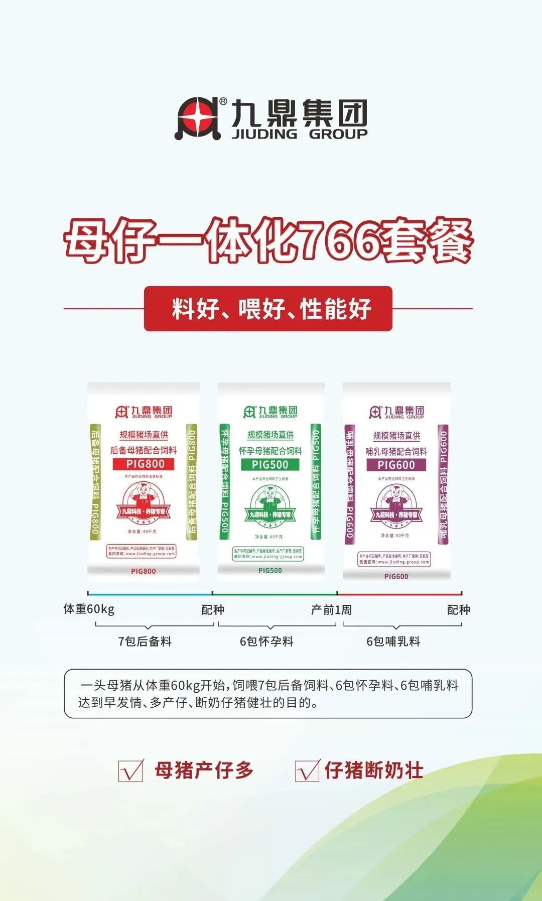 九鼎集團(tuán)專注豬料生產(chǎn)研發(fā)29年,致力于為廣大養(yǎng)殖企業(yè)提供優(yōu)質(zhì)高效的飼料產(chǎn)品,在全國擁有分子公司近30家,年銷售飼料200萬噸,此次展會(huì)推出了全新的套餐系列: